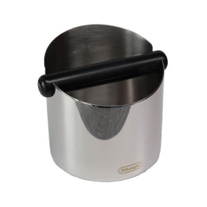DeLonghi Abklopfbehälter aus rostfreien Edelstahl wird mit aufgedrucktem Hersteller Logo und einem rutschfesten Gummiboden geliefert.
