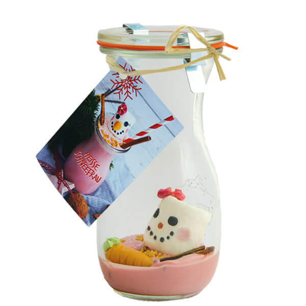 Heiße Schneefrau - Marshmallow mit Erdbeer-Schokolade zum Aufgießen mit heißer Milch.